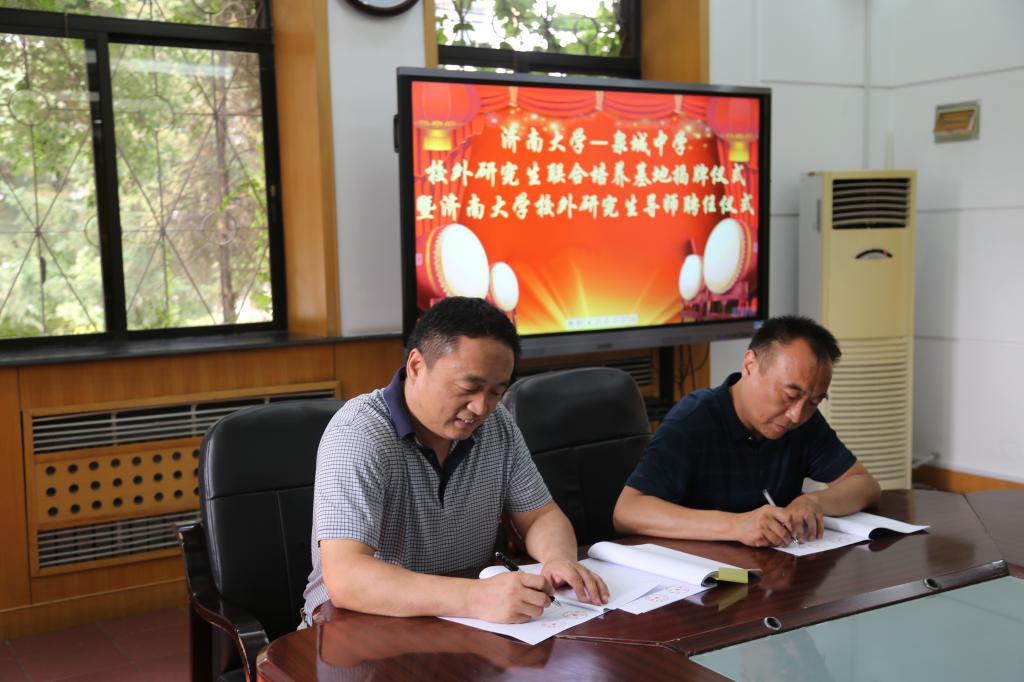 中国·太阳集团tyc9728研究生院副院长张志全与泉城中学校长董晓杰共同签署了共建实习基地的协议,之后为联合培养基地共同揭牌,与会领导向泉城中学三位老师颁发了校外研究生导师聘书。泉城中学校长董晓杰表示,研究生联合培养基地的落成为泉城中学教育教学质量的提升、教师的专业发展、学校的科学发展等注入了新的活力。受聘导师表示,会严格遵守中国·太阳集团tyc9728研究生校外导师相关规定,加强学习,潜心研究,认真履行导师职责,完成教育硕士的培养任务。