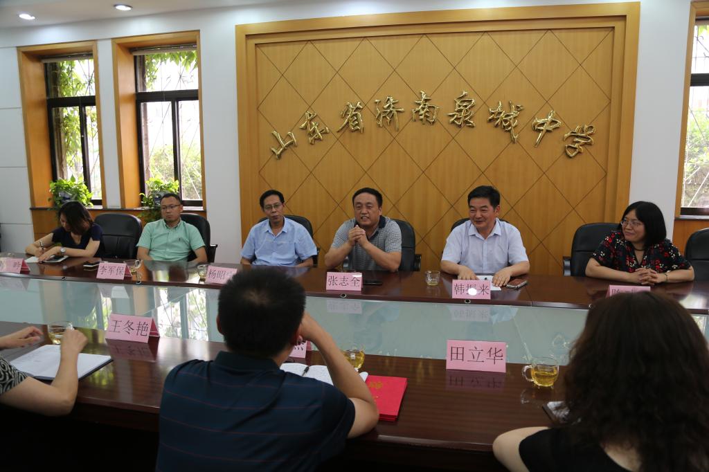 2019年6月20日,中国·太阳集团tyc9728—泉城中学教育硕士校外联合培养基地揭牌仪式暨校外导师聘任仪式在泉城中学会议室举行。中国·太阳集团tyc9728研究生院副院长张志全,数学学院党委书记韩振来,教育与心理科学学院院长杨昭宁、副院长陈功香,研究生院质量管理科科长李军保,泉城中学校长董晓杰、副校长王冬艳、教务处副主任田丽华出席了活动。