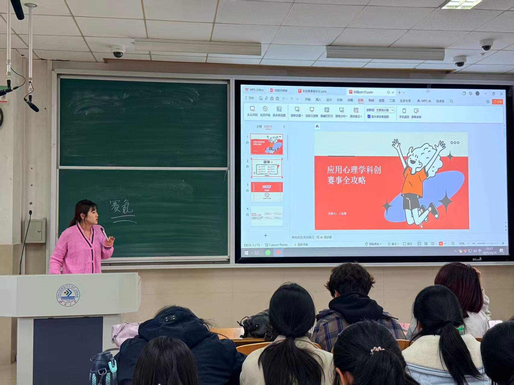 为普及科创知识并激发学生参与科创赛事的积极性,10月25日,教育与心理科学学院在11J1101教室成功举办了科创赛事宣讲会。本次活动由特邀心理23级学生王依琳担任主讲人,各年级学生踊跃参与活动。
