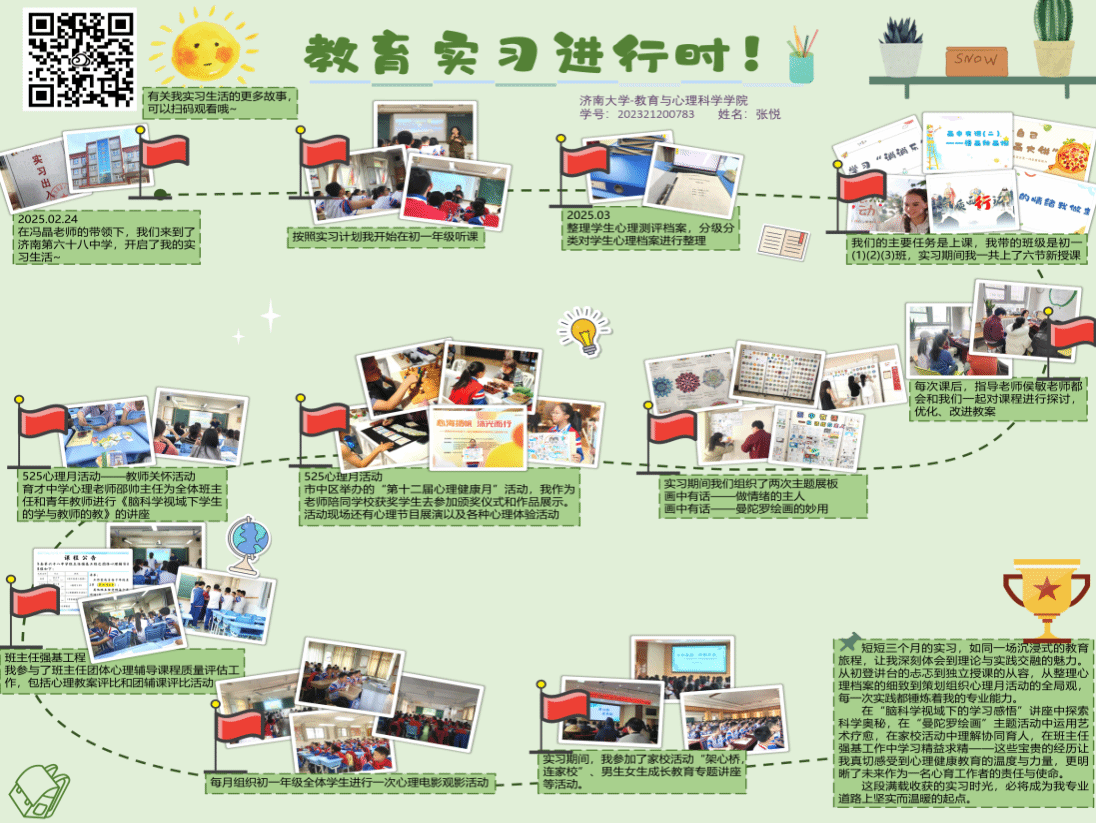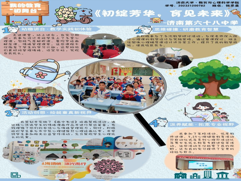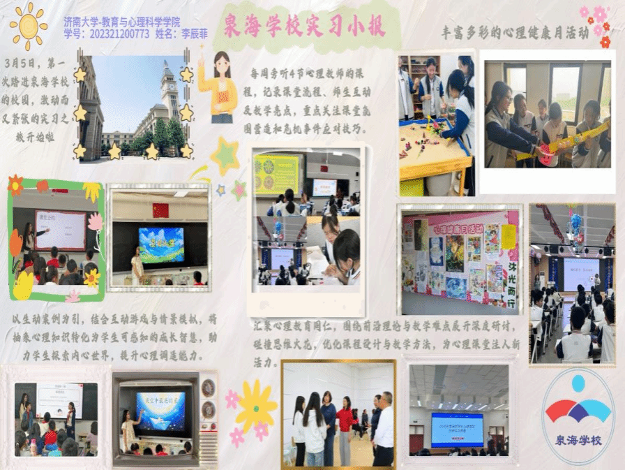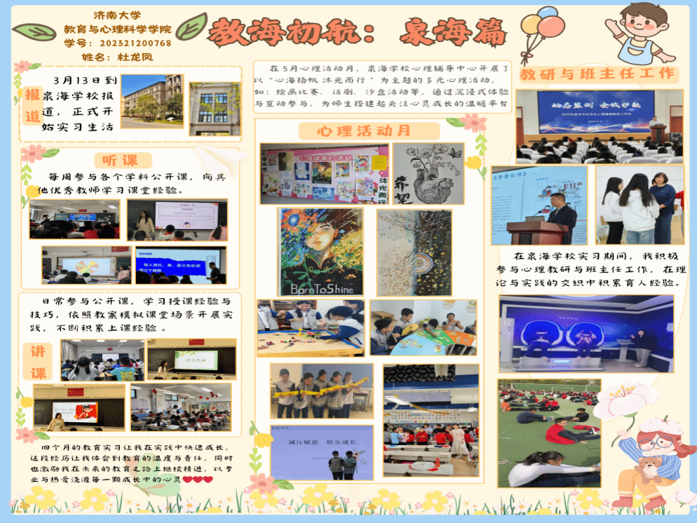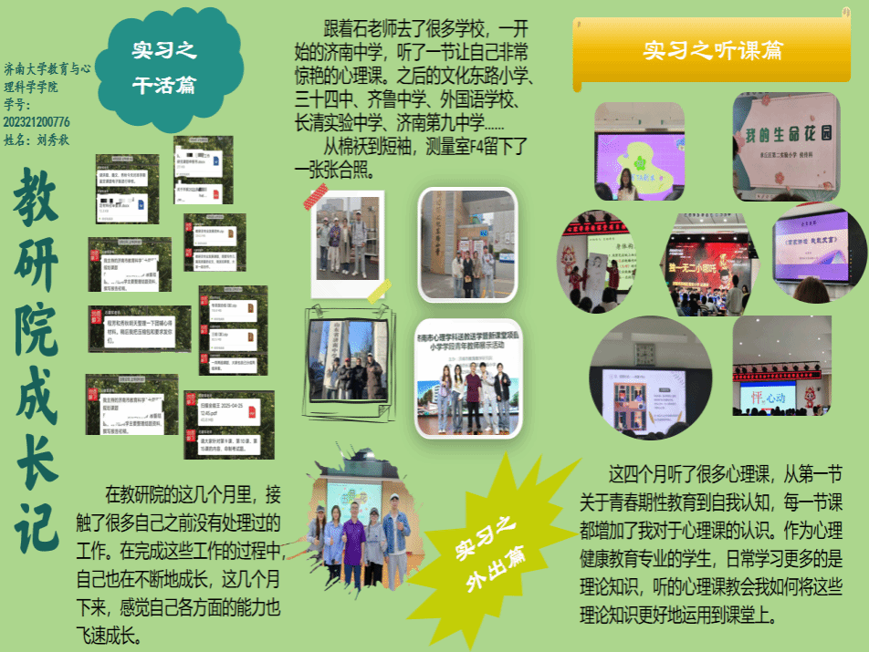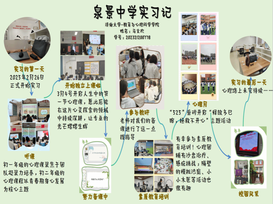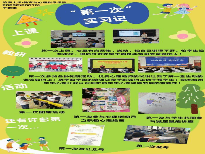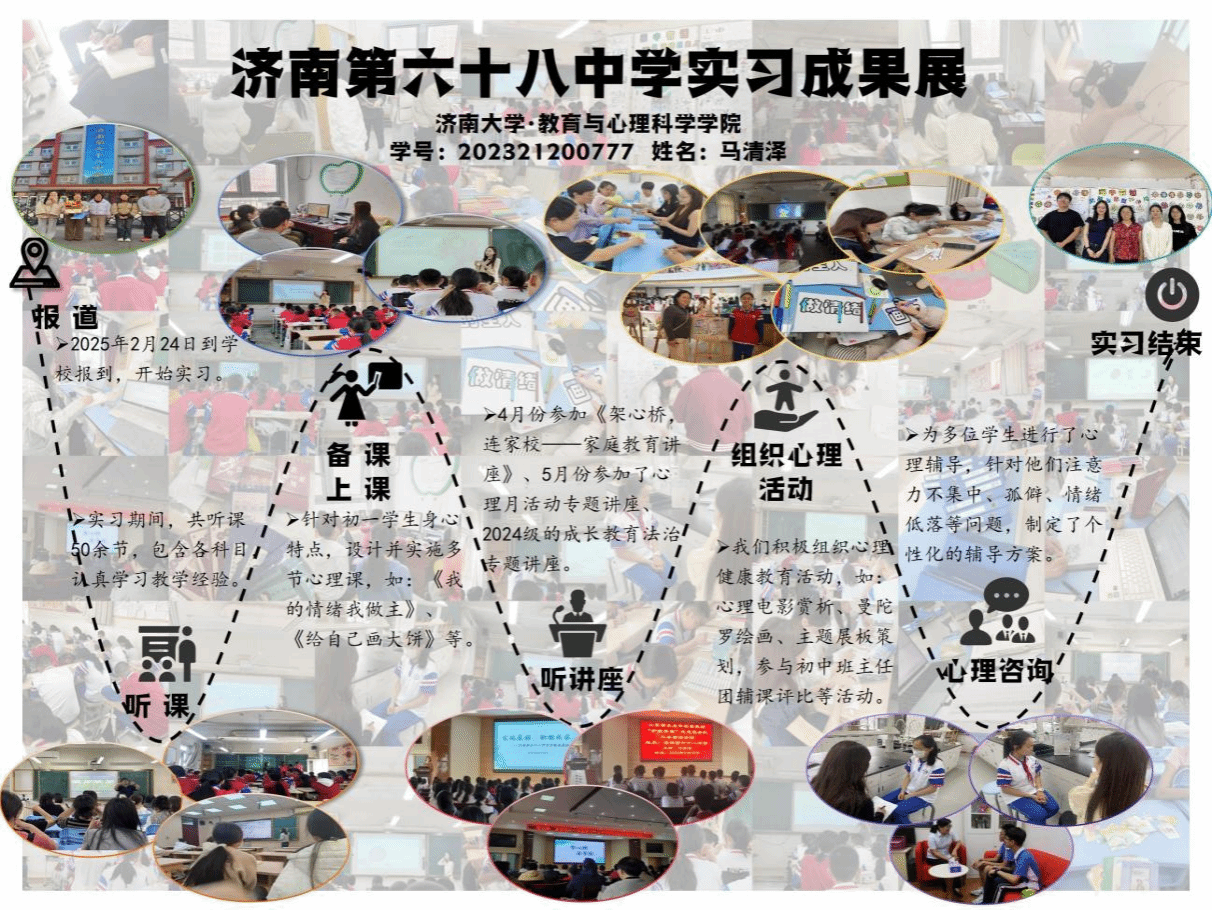 2025年春日,我院2023级的20名心理健康教育领域的研究生怀揣着对教育事业的满腔热忱奔赴山东各地实习。从济南市教研院到莱州金城中学,从济南泉城中学、济南泉海学校到济南泉景中学,从济南十六里河中学、济南第六十八中学到博山五岭路小学,他们严于律己,以身作则,在鲜活且真实的教育场景里,努力蜕变,最终圆满的地完成了从“准教师”到“真教师”的蜕变。这20名研究生坚定地在教育的肥沃土地上扎根,充分利用信息化教学手段,像是给学生课堂注入了活力的催化剂,让其瞬间焕发生机。