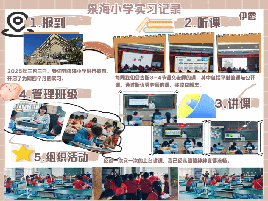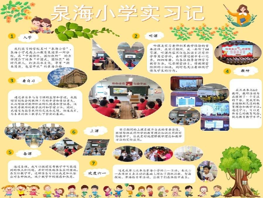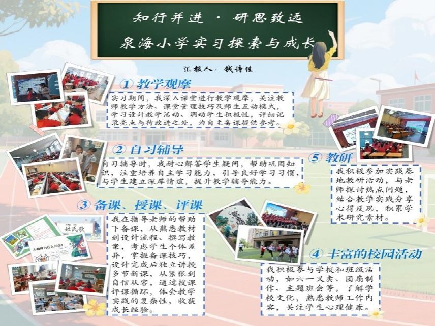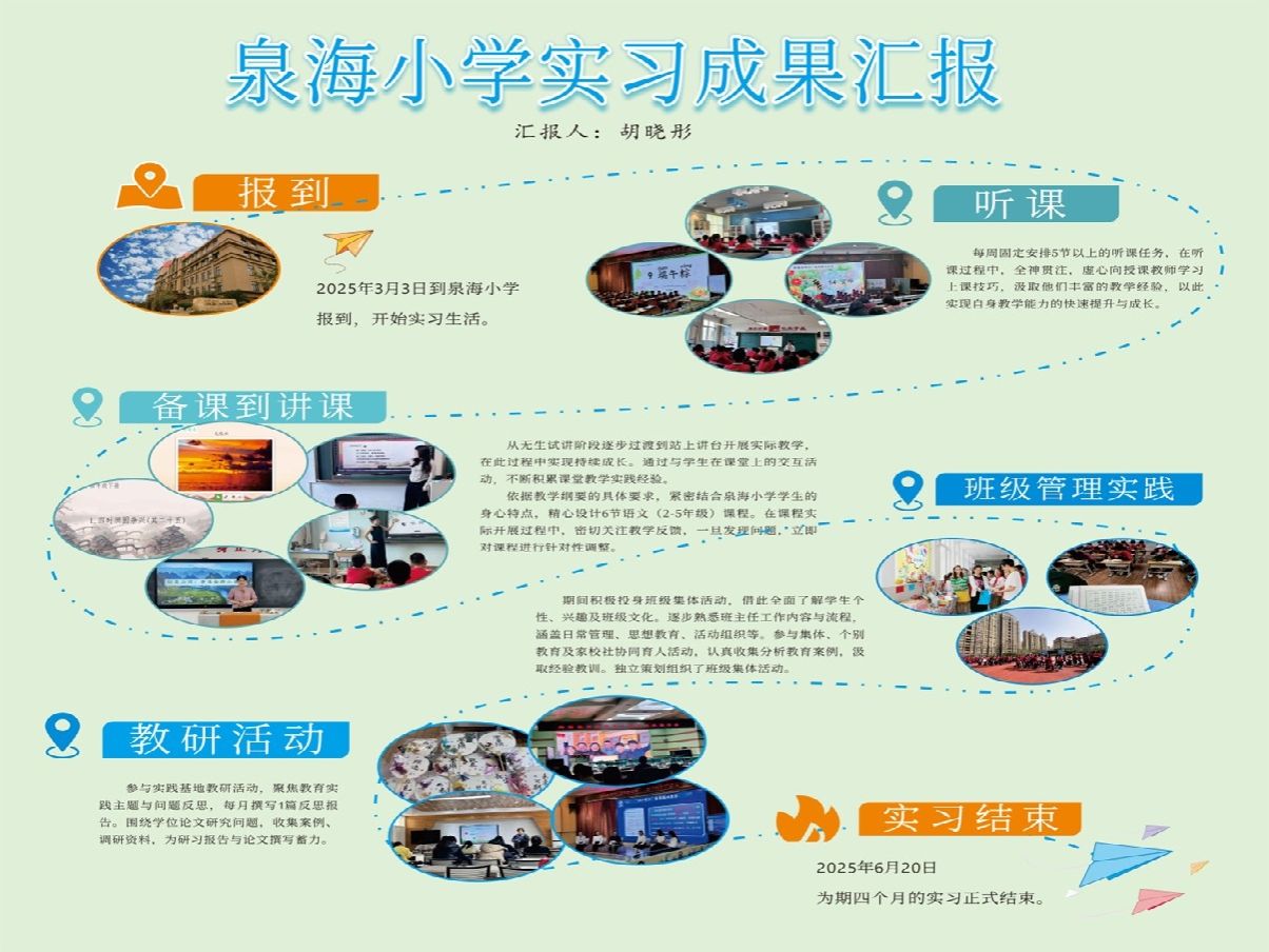 2025年春日,我院2023级5位小学教育领域研究生怀揣教育热忱,走进泉海小学,开启了一段从“理论探索者”到“实践引路人”的成长之旅。在鲜活的教育场景中,5位研究生严于律己、以身作则,以“准教师”身份深度融入校园生活。实习期间,她们立足小学学段特点,将教育学原理与儿童认知规律相结合,在语文课上以情境教学唤醒阅读热情,在数学课中用生活化案例破解抽象概念,在班队活动中以童心视角设计成长课程,运用多媒体工具打造“互动课堂”,让知识在童趣中自然生长。