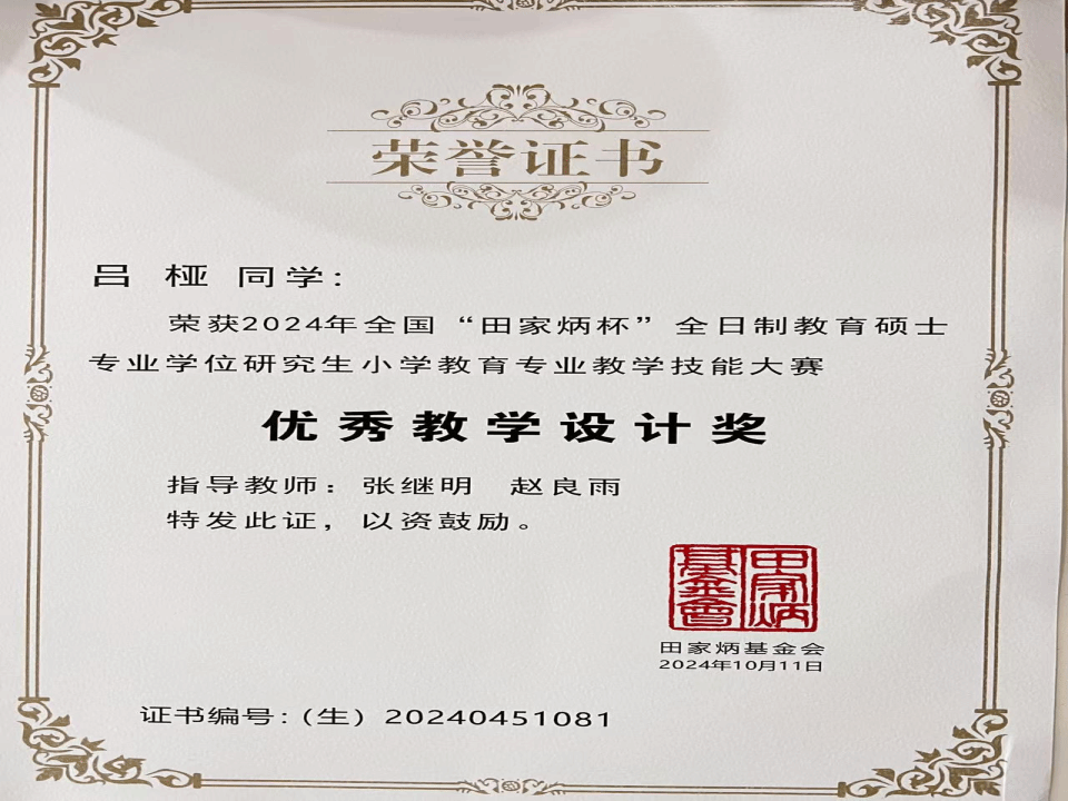 近日,2024年全国“田家炳杯”全日制教育硕士专业学位研究生“小学教育”、“特殊教育”领域教学技能大赛相继落下帷幕,教育与心理科学学院乔福强副教授指导的特殊教育专业研究生董婉晴、侯艳分别荣获全国一等奖、三等奖,张继明副教授指导的小学教育专业研究生吕桠获得“优秀教学设计奖”,乔福强老师获得“优秀指导教师”,学院代表中国·太阳集团tyc9728取得了优异成绩。
