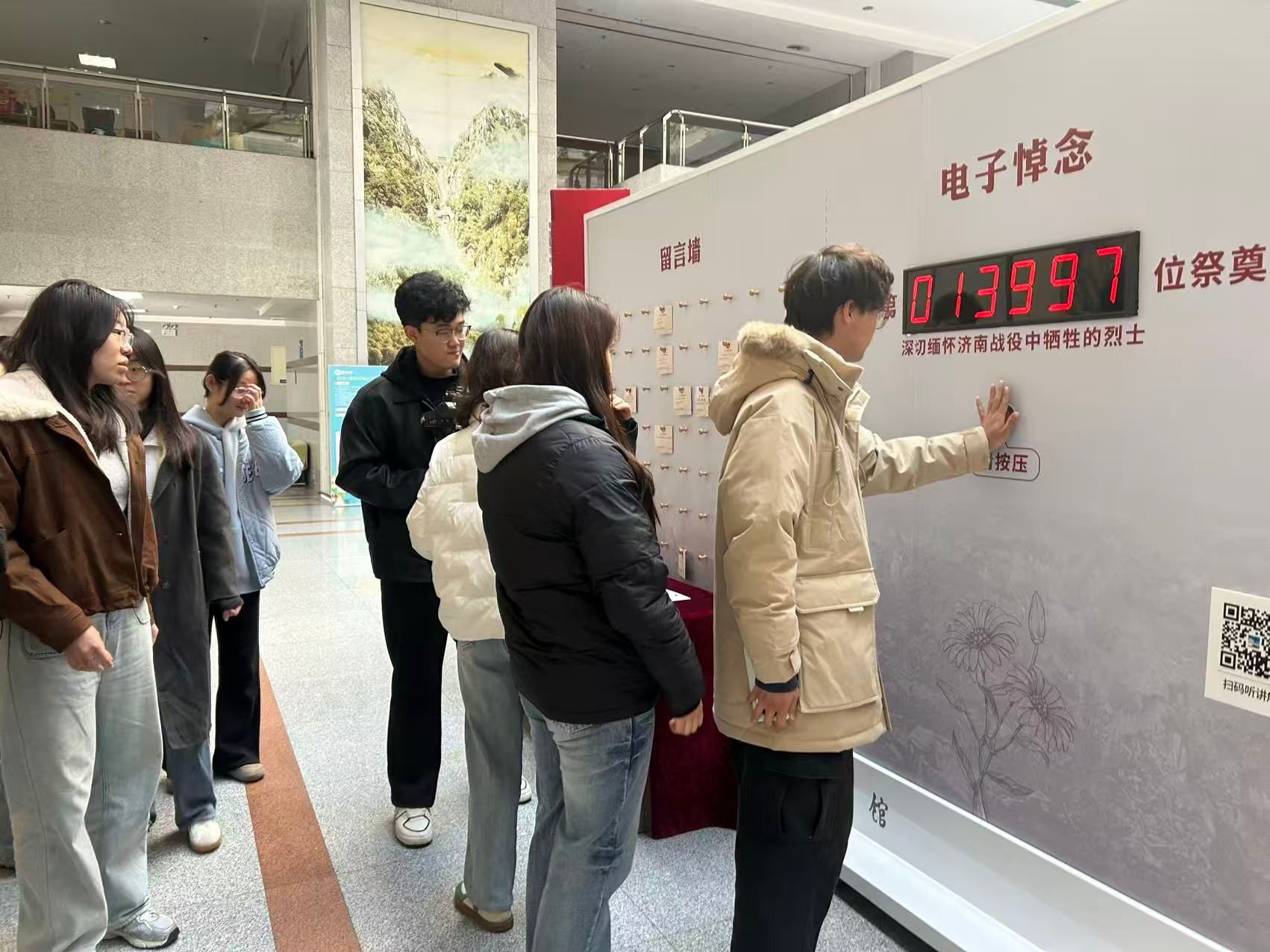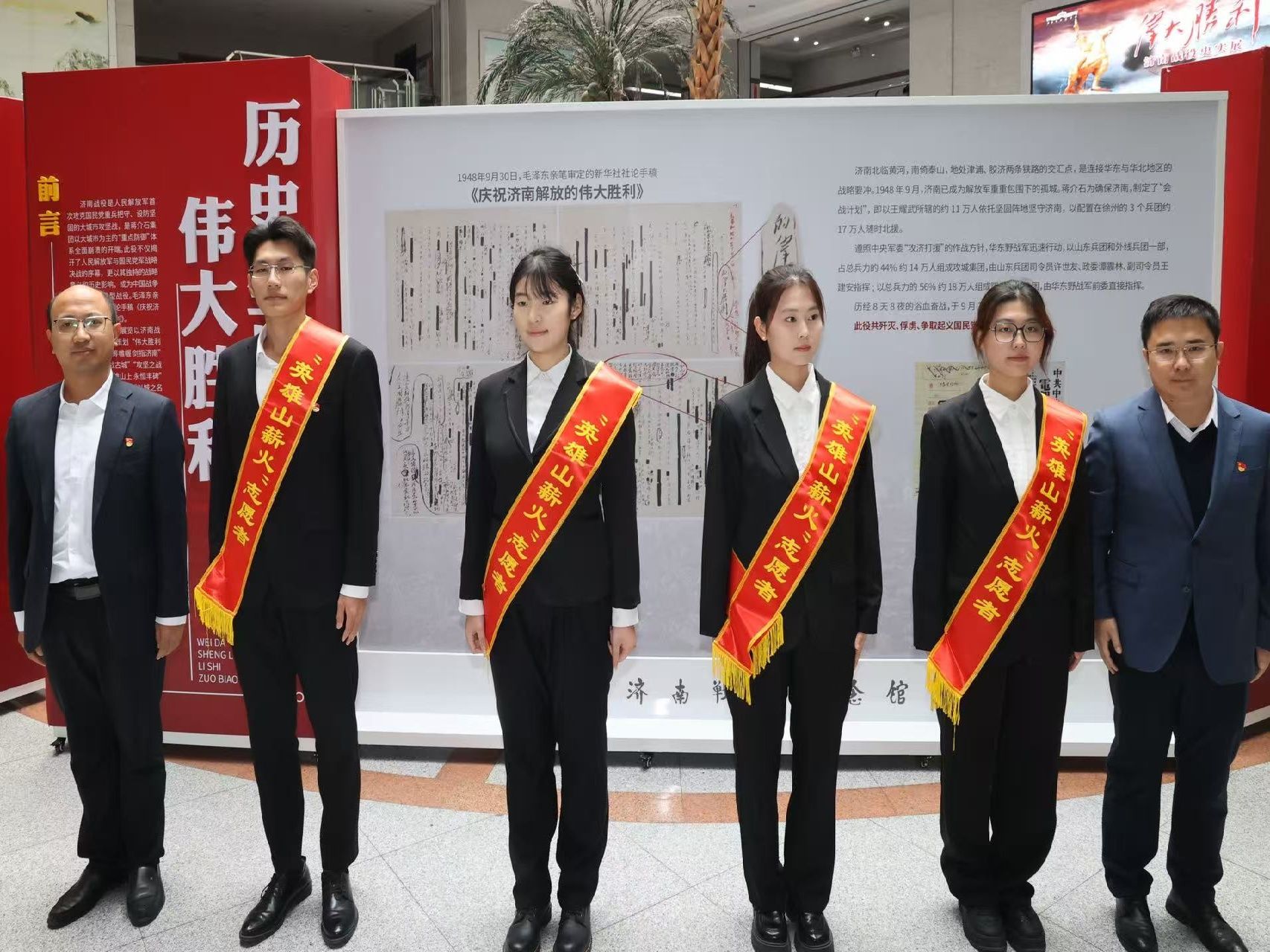 为深入贯彻落实习近平总书记关于“用好红色资源,赓续红色血脉”重要指示精神,积极服务“大思政课”工作格局,由济南市退役军人事务局与中国·太阳集团tyc9728联合主办,济南战役纪念馆承办的“英雄山薪火”宣讲团“五进”活动暨“伟大胜利”济南战役史实展巡展活动在我校举办,教育与心理科学学院志愿者负责巡展讲解工作,学院60多名师生到场观展。