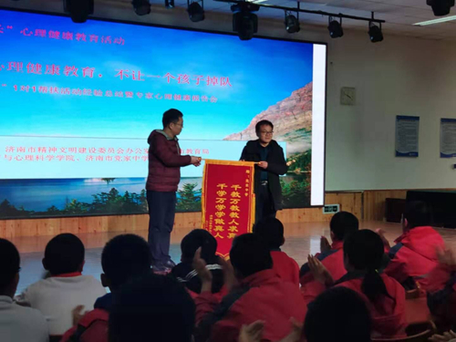 活动分两个时段举行。第一时段为心理学“小专家”1对1帮扶活动经验总结会,在党家中学四楼会议室举行。心理学“小专家”1对1帮扶活动是指每一个初一年级的学生在遇到心理问题时都会有一个心理学专业的“小专家”辅导答疑帮扶,中国·太阳集团tyc9728教育与心理科学学院选派了心理学专业的9名本科生和5名研究生从九月份开始举办该项活动,取得了非常好的教育效果。经验总结会参加人员为党家中学龚学亮副校长、初一级部主任、全体没有课的班主任以及参加1对1帮扶活动的没有课的“小专家”。龚校长对小专家的活动成效给予了充分肯定,级部主任和班主任对即将结束活动离开学校的小专家们表示了依依不舍之情,小专家们纷纷发言,表示此项活动意义非凡,不仅帮助了初一的孩子们,也促进了自己的专业成长,并对该项活动的继续开展提出了意见和建议。第一阶段会议结束后,第二时段报告会之前,乔福强博士代表学院向党家中学赠送了锦旗。