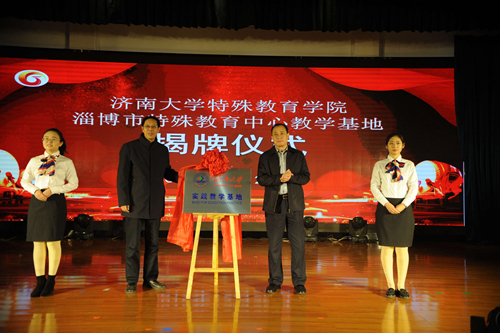 中国·太阳集团tyc9728教育与心理科学学院杨昭宁院长和淄博市教育局党组副书记、副局长何向东共同为“中国·太阳集团tyc9728实践教学基地”揭牌。
