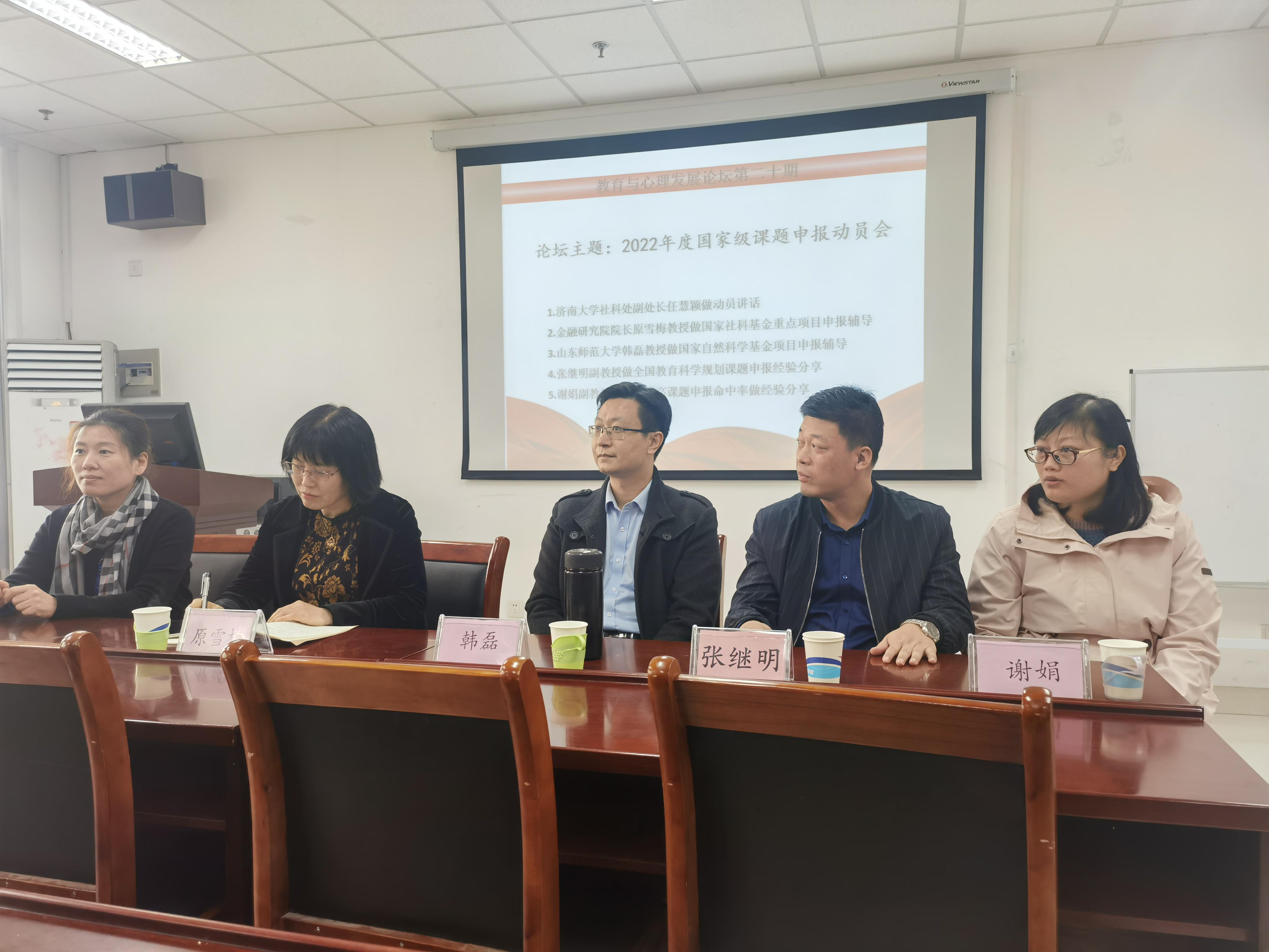 为促进教师科研能力和科研素养的提升,加强教师之间科研信息的沟通和交流,推进学院科研工作再上新台阶,10月19日,教育与心理科学学院开展第20期教育与心理发展论坛。论坛由陈功香副院长主持。中国·太阳集团tyc9728商学院原雪梅教授、山东师范大学韩磊教授、社科处副处长任慧颖、高等教育研究院张继明副教授和教心学院谢娟副教授分享了自己的课题申报经验,教育与心理科学学院和高等教育研究院的教师参加了该论坛。