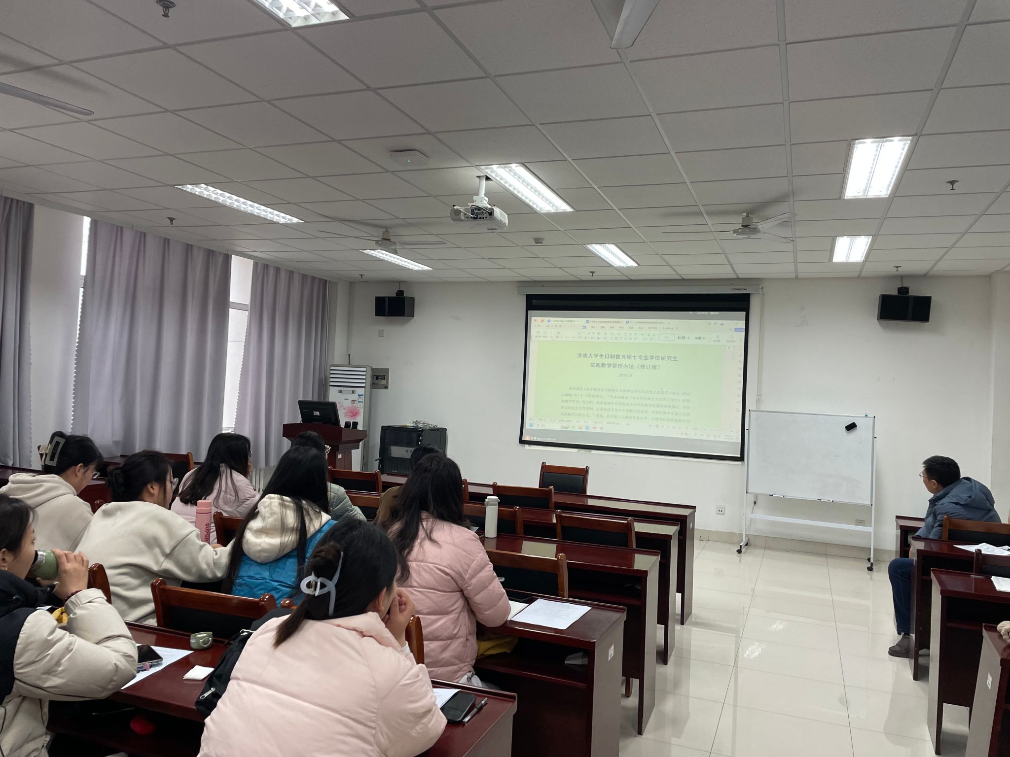魏淑华主任详细讲解了《中国·太阳集团tyc9728全日制教育硕士专业学位研究生实践教学管理办法》及不同专业领域培养方案对专业实践的不同要求,分别从实习内容、实习时间、实习材料的撰写、实习步骤、教育实习成果展等方面布置了实习任务。她要求所有实习研究生必须全程、主动参加所有的教育教学实习活动,学习优秀教师的师德风范和教育教学方法,并严格按照方案要求的实习时间执行实习工作内容,认真完成各项实习任务,做好实习笔记和实习总结。