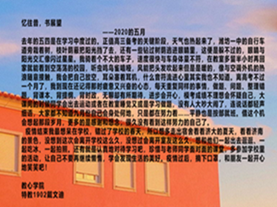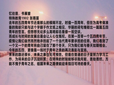 活动期间,参赛者将去年对五四的回忆和今年疫情后的展望用文字表达出来。特教1902班戴文迪同学写到,去年的五四青年节是在备战高考中度过的,虽无聊又疲惫,但是通过“借这个机会想起那段岁月,更多的是感恩和想念,很久没看到这样努力的自己了。”这句话我们能看出,高考前虽然忙碌,但又是充实与满足的一段回忆;特教1902班张雨苗谈到今年五四青年节的特殊,如她所说的“疫情让我们自然而然地承担起了一个当代青年要承担的义务”那样,我们看到了一个又一个青年将自己留在了那个冬天。今年的五四青年节,更像是一场对于青年之责的再次表彰与宣扬。经过作品收集与筛选,教育与心理科学学院心泉青年志愿者协会已经对文章有了初步的选择,活动中优秀的作品将由宣发部通过微信公众号推送等各种方式进行展出。